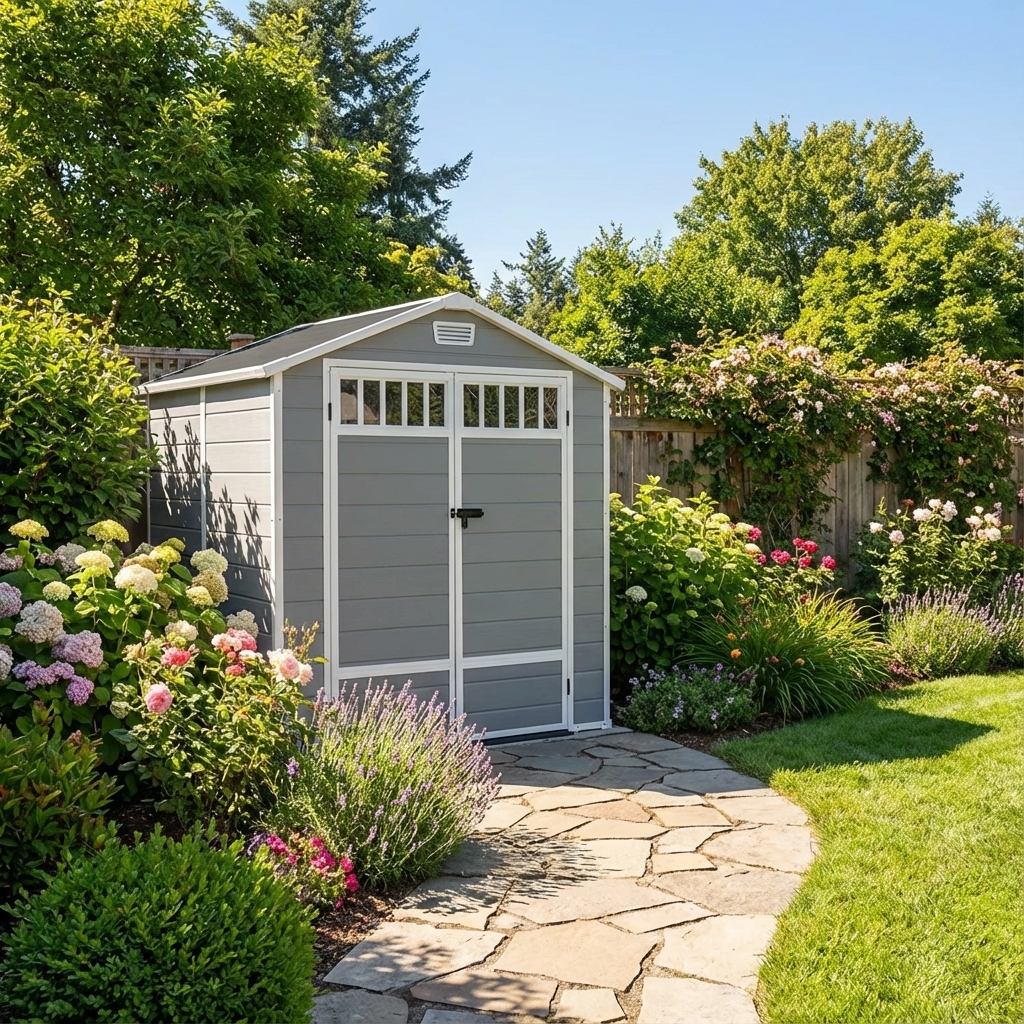 The shed comes with a reinforced resin floor panel that supports heavy items while protecting contents from ground moisture, dirt, and uneven surfaces. This added stability ensures long-lasting durability and clean storage.