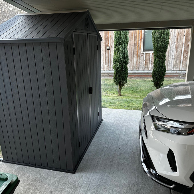 Perfect size for a small backyard. I use it to store gardening tools, hoses, and outdoor furniture covers. The graphite color looks very modern and blends well with our patio.
