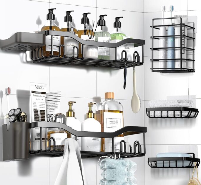 7-Pack Stainless Steel Shower Shelves – Adhesive Hanging Shower Caddy Set