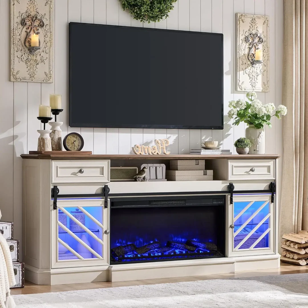 Electric Fireplace Comfort: The built-in electric fireplace features adjustable flame lighting and can be used with or without heat. This electric fireplace tv stand warms areas up to 400 sq. ft., making it a versatile entertainment center with fireplace for all seasons.