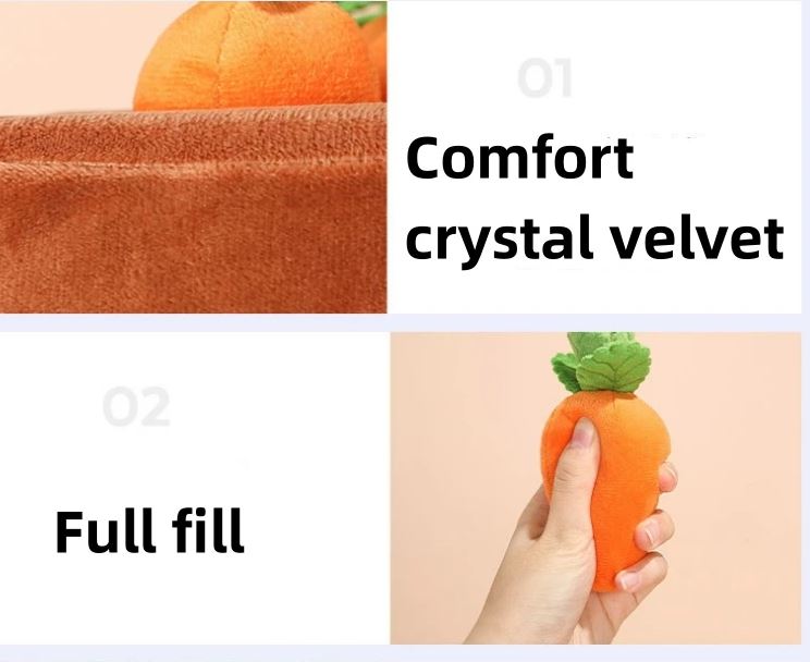 This toy has been great for my dog’s anxiety. He plays quietly and stays relaxed even after long sessions. The plush texture is gentle on his teeth, and the carrots fit snugly so they don’t fall out easily.