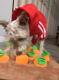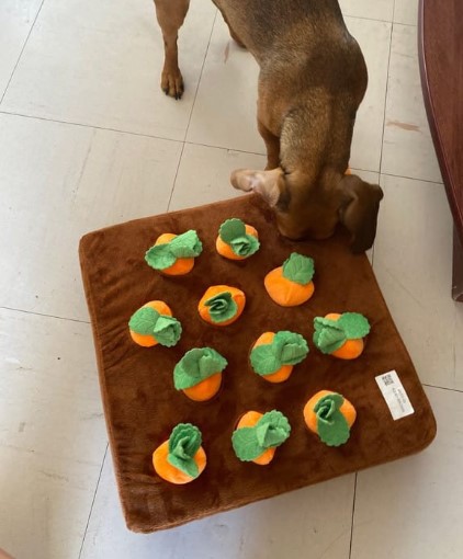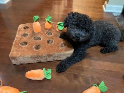 My puppy absolutely loves this toy. He enjoys pulling out the carrots and bringing them back to me to hide again. It’s a wonderful interactive and calming activity that keeps him happy without overstimulation.