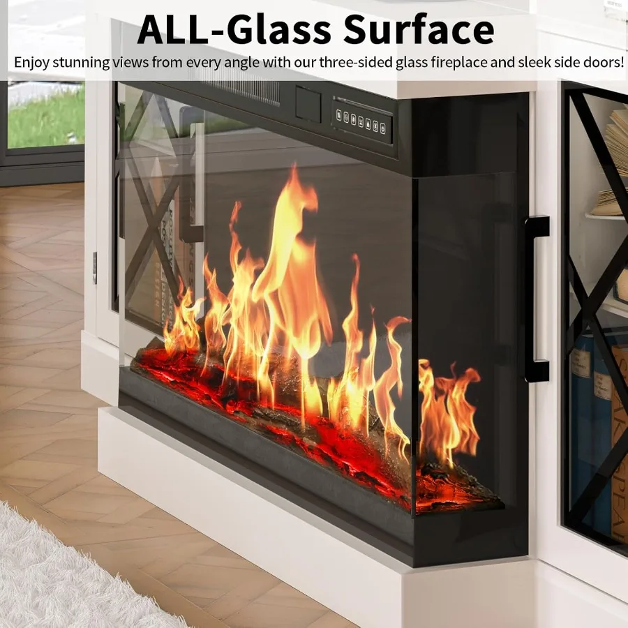Upgrade your living room with this modern 3-sided electric fireplace TV stand, designed to bring warmth, style, and functionality into one stunning centerpiece. With a 65-inch wide entertainment console and a 30-inch LED electric fireplace, this unit blends contemporary aesthetics with premium comfort—perfect for any home.