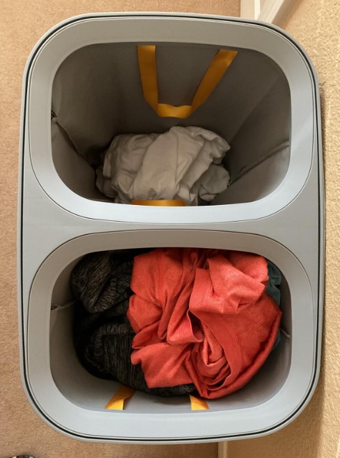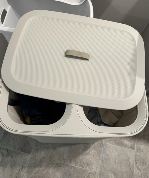 The double laundry hamper design is extremely practical. I use one side for lights and the other for darks. The lid keeps everything looking neat and clean.
