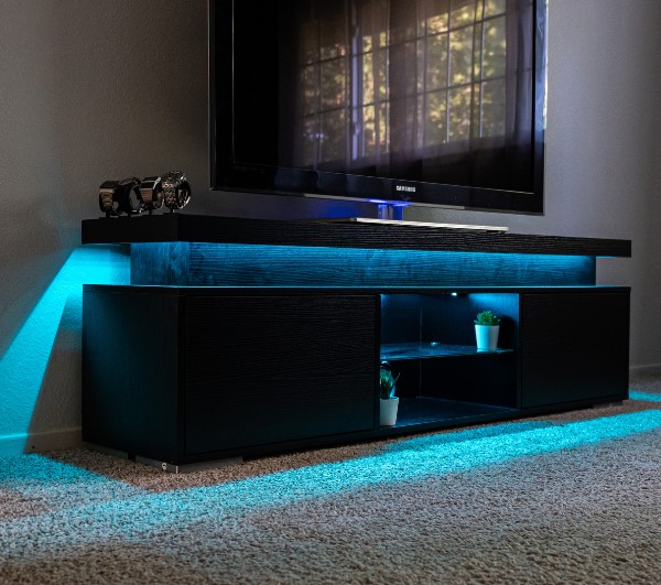 This TV stand completely upgraded our living room. The LED lights look amazing at night, and the built-in outlets are a total game changer. Plenty of space for our gaming console and sound system. Very sturdy and well made.
