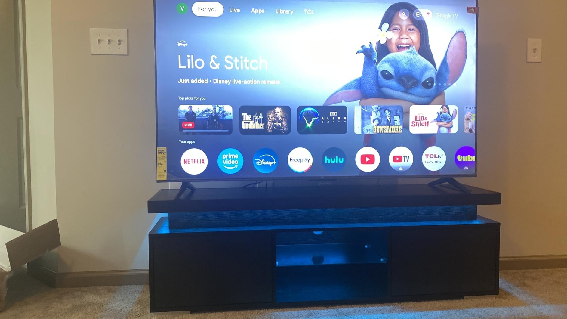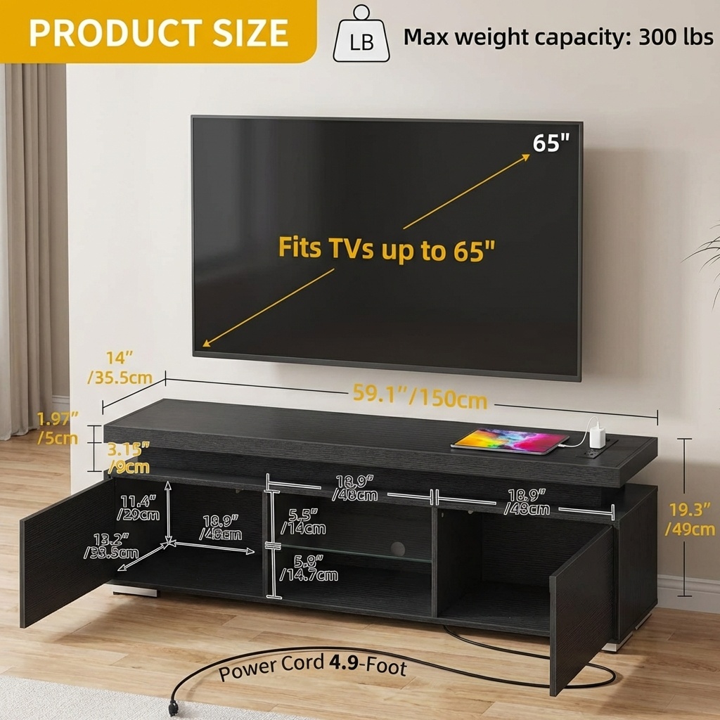 Fits our 65-inch TV perfectly and feels very solid. The power outlets and USB ports are super convenient, especially for charging controllers and phones. The LED lighting adds a cool vibe for movie nights.