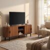 This mid century modern tv stand keeps your entertainment area organized with enclosed storage that hides mess while staying easy to access.