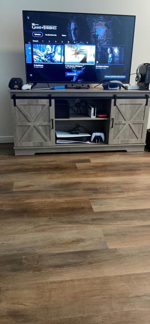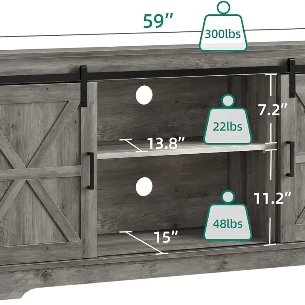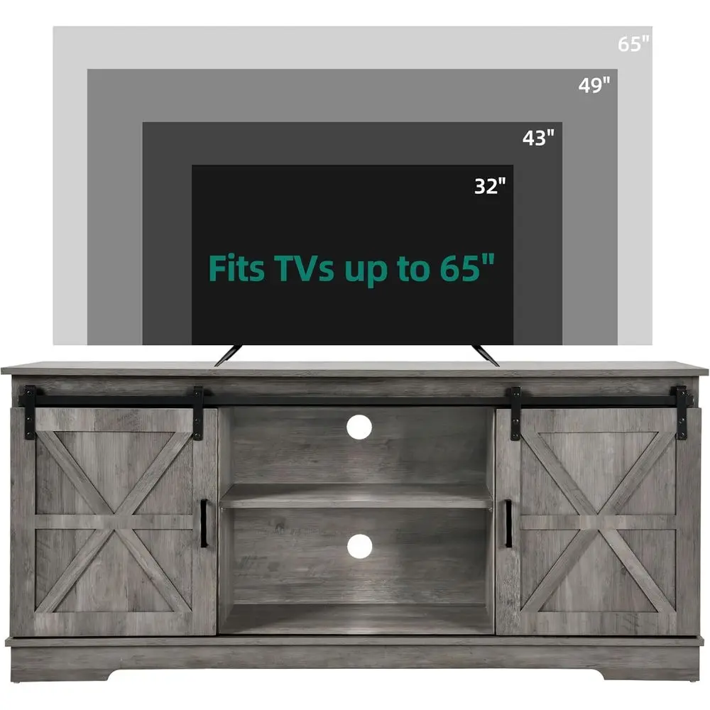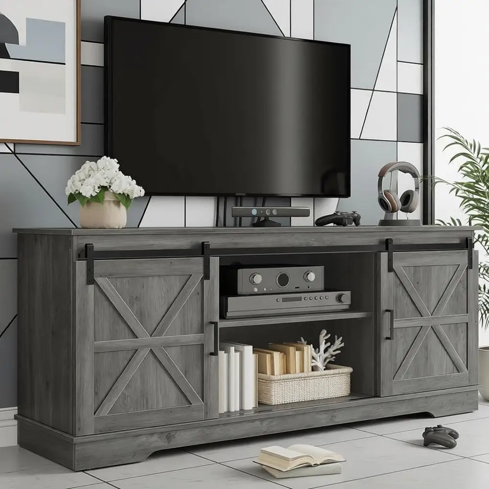 This TV stand fits my 60-inch TV perfectly and looks amazing in our living room. The sliding barn doors add a modern rustic vibe, and I really like having both open shelves and a closed cabinet for storage.