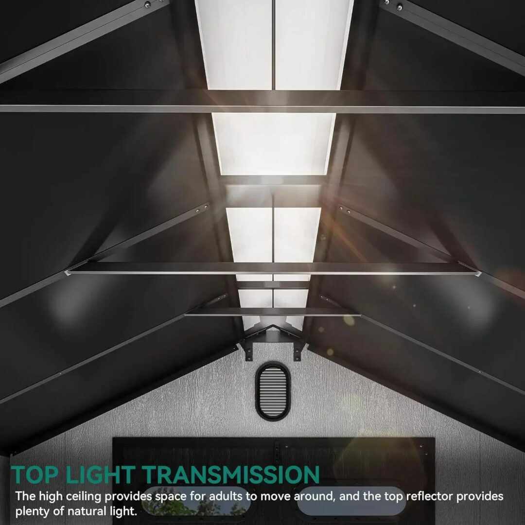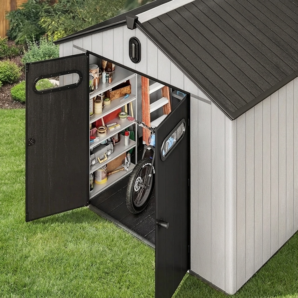 This 8×8 resin storage shed offers 427 cubic feet of space, ideal for storing garden tools, lawn equipment, bicycles, patio furniture, and outdoor accessories. It can also be used as a pet shelter or small greenhouse.